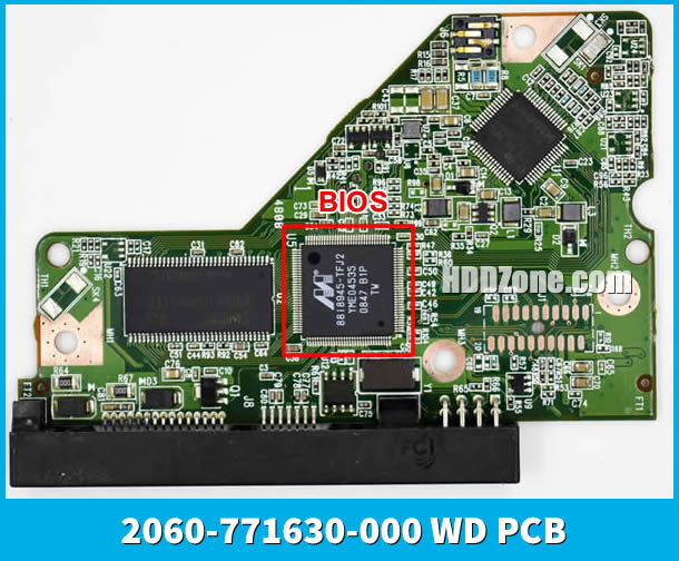 sur le carte PCB WD 2060-771630-000, la puce du BIOS est généralement située à proximité de la puce de contrôle principale. Il se présente sous la forme d’une petite puce carrée noire avec un boîtier à 8 broches. Notez qu’avec les progrès de la technologie des disques durs, certains disques durs peuvent avoir plusieurs puces BIOS (2 à 6), qui doivent toutes être remplacées lors du transfert du micrologiciel. Et certains PCB ont des puces BIOS intégrées à l’intérieur de la puce principale (la plus grande puce de la carte), généralement avec de nombreuses broches, et une certaine quantité de technologie est nécessaire pour les remplacer.